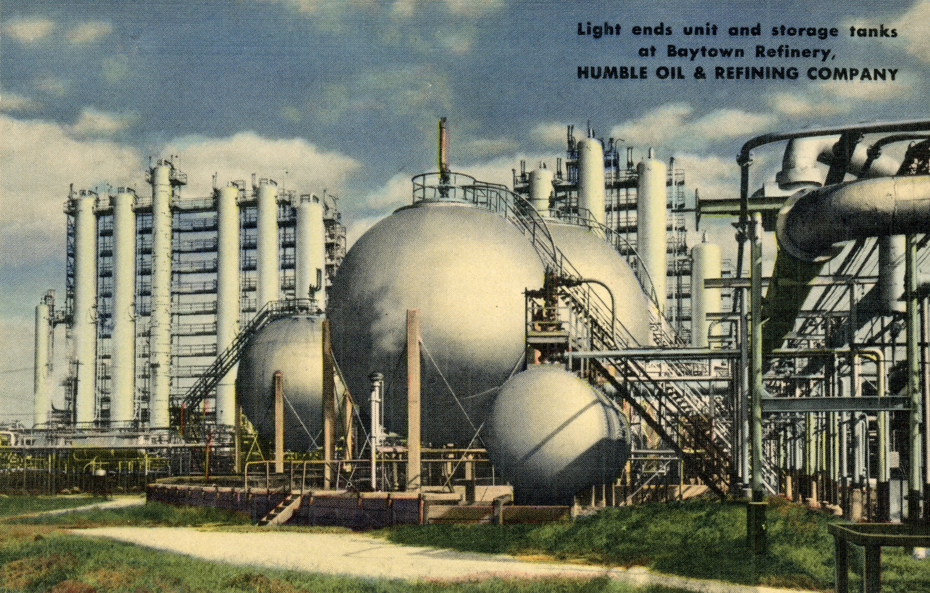Front of post card notes "Light ends unit and storage tanks of Baytown Refinery, Humble Oil & Refining Company". Reverse reads: Baytown Refinery - Humble Oil & Refining Company. One of the nation's largest, located 23 miles southeast of Houston on the ship channel. Here 6,800 men and women direct and control the magic of heat, pressure, and chemistry to transform more than 240,000 barrels of crude oil a day inot the fuels, lubricants, and other petroleum products so necessary to our daily lives. Free conducted tours - 2:00 p.m. daily. Date unknown.