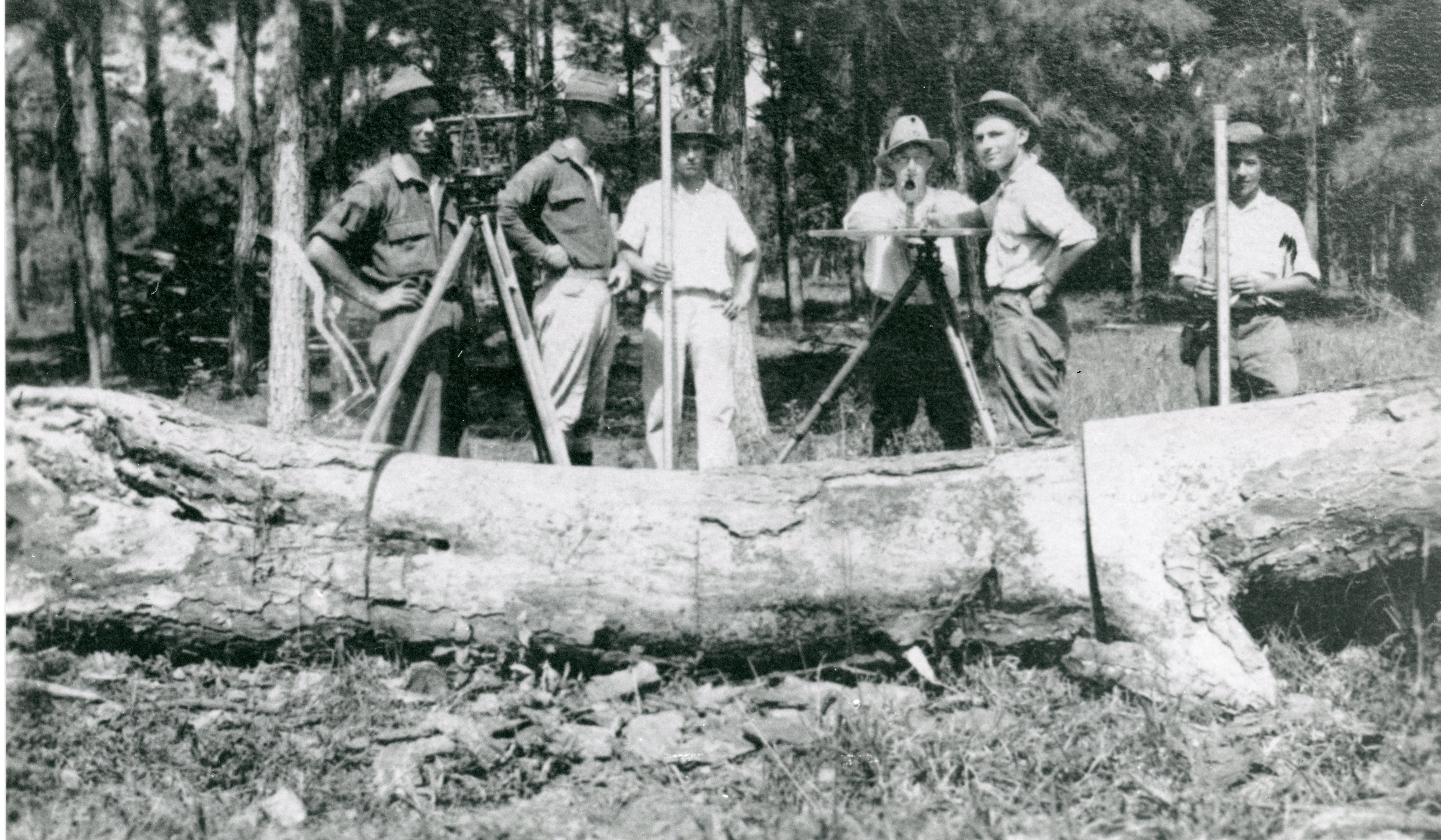 Early Preparation for Humble Oil & Refining Company's Baytown Refinery. Field engineers surveyed the old rice field, a 2,220-acre tract, as the first crew to work at the Baytown Refinery. Photo was made September 29, 1919. Left to right: Transitman Stuart, Party Chief H. Leroy Bell, Henry Geffin, Willie Wooten, Ross Colley, and Wagenspack