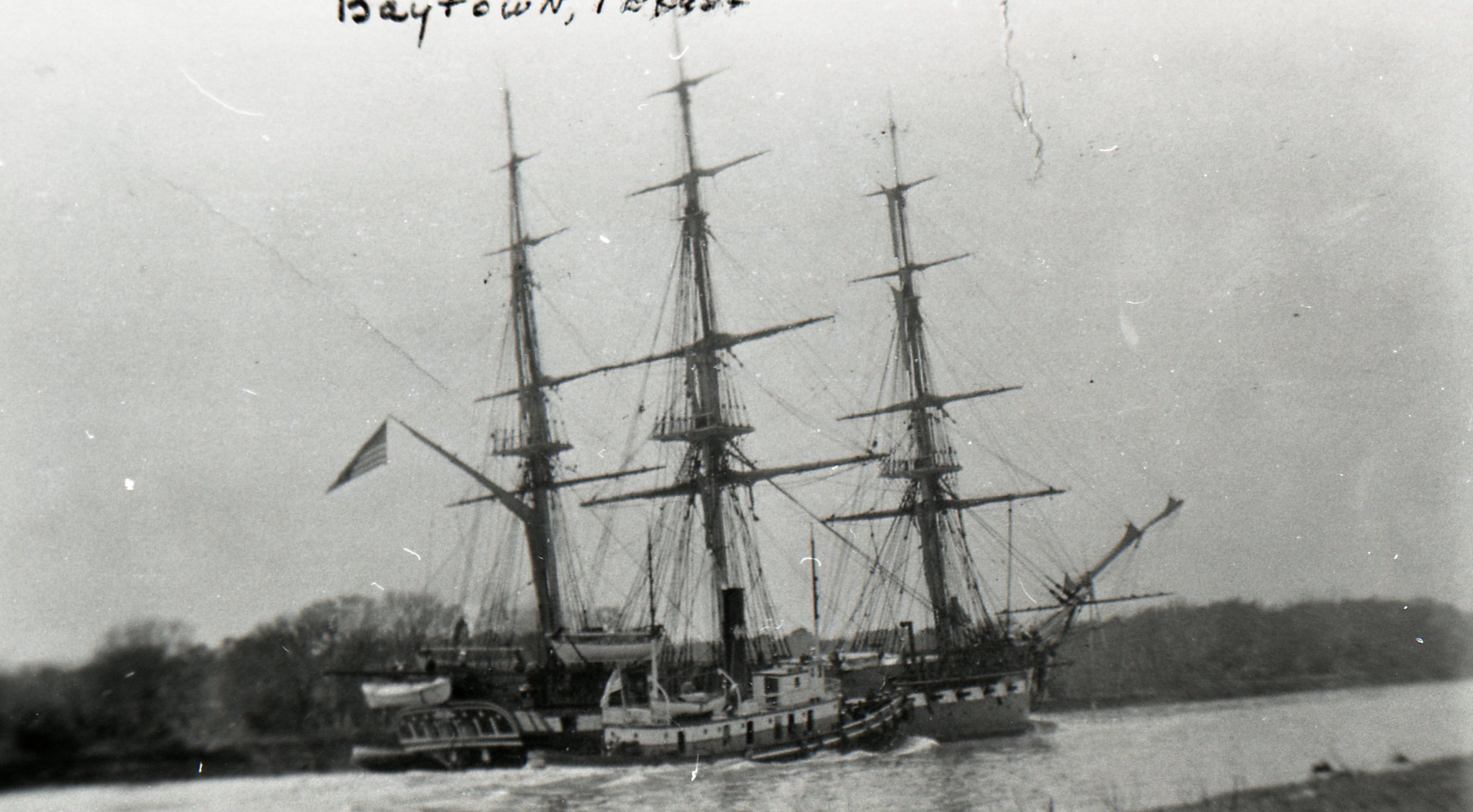 "Old Ironsides" being pushed up the Houston Ship Channel by a tug boat near the Humble (Exxon) docks in 1932.