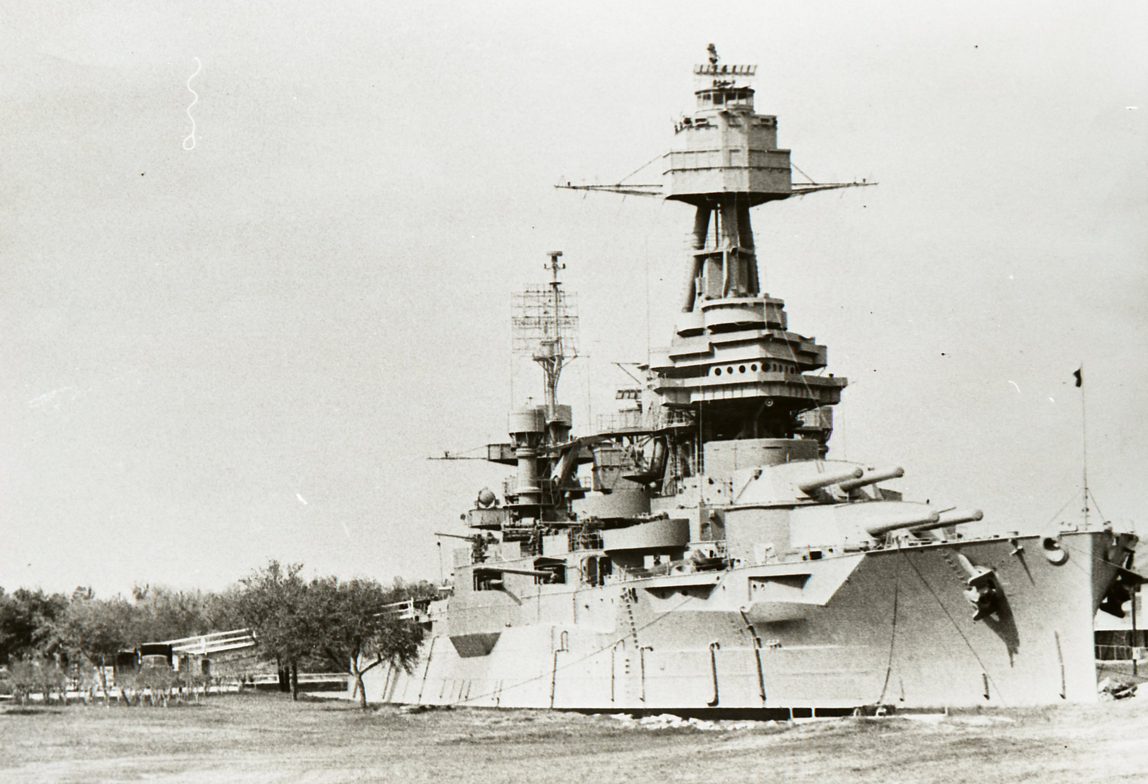 A close-up of the Battleship Texas, a former World War II ship, being retired to the San Jacinto Battlefield. The battleship was retired from service in 1948, and was purchased by the state of Texas.