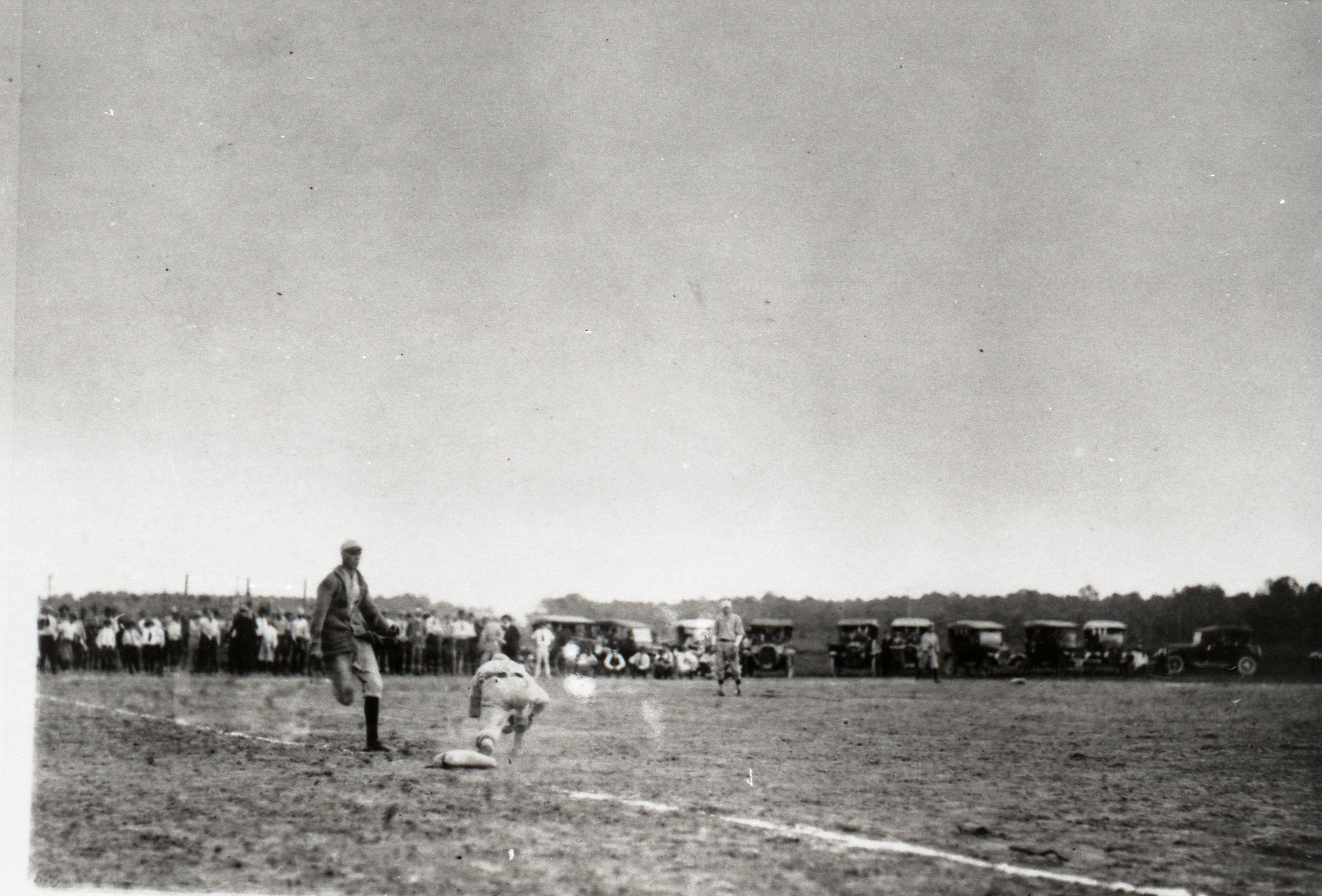 Jack Ward beats out a close one at first on old baseball diamond, 1920-1921. Pruett field on present campus of Lee College.