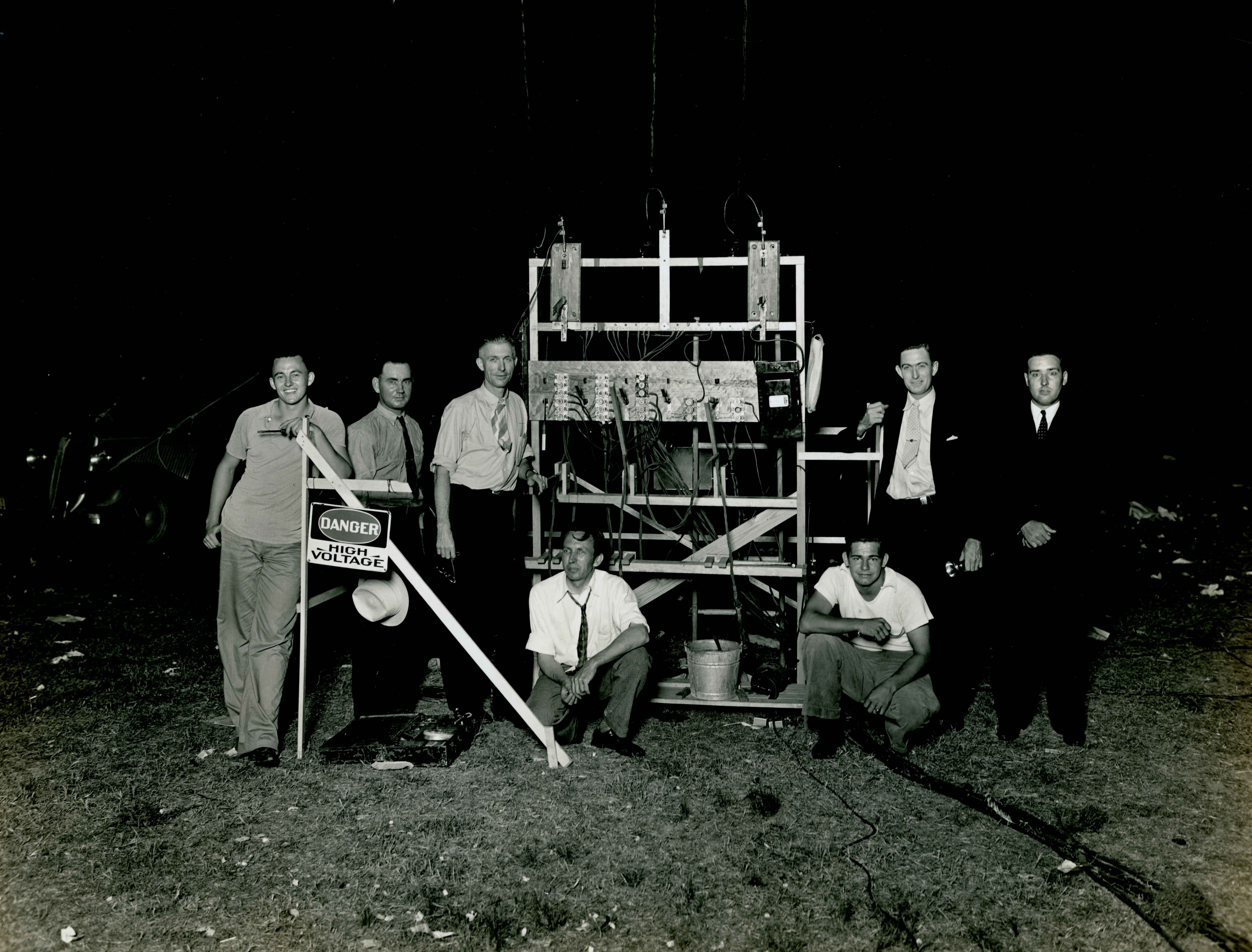 Centennial pageant technical crew; An elaborate system of lighting effects, special sound equipment, a telephone communication system for the technicians and directors, and a string of powerful floodlights for a curtain between scenes, completed the setup of mechanical equipment equal to the magnitude of the undertaking. James G. Blount and Karl Love Springer, assisted by a corps of technicians, had charge of the lighting effects. The sound equipment was in the charge of H.S. Keith.
