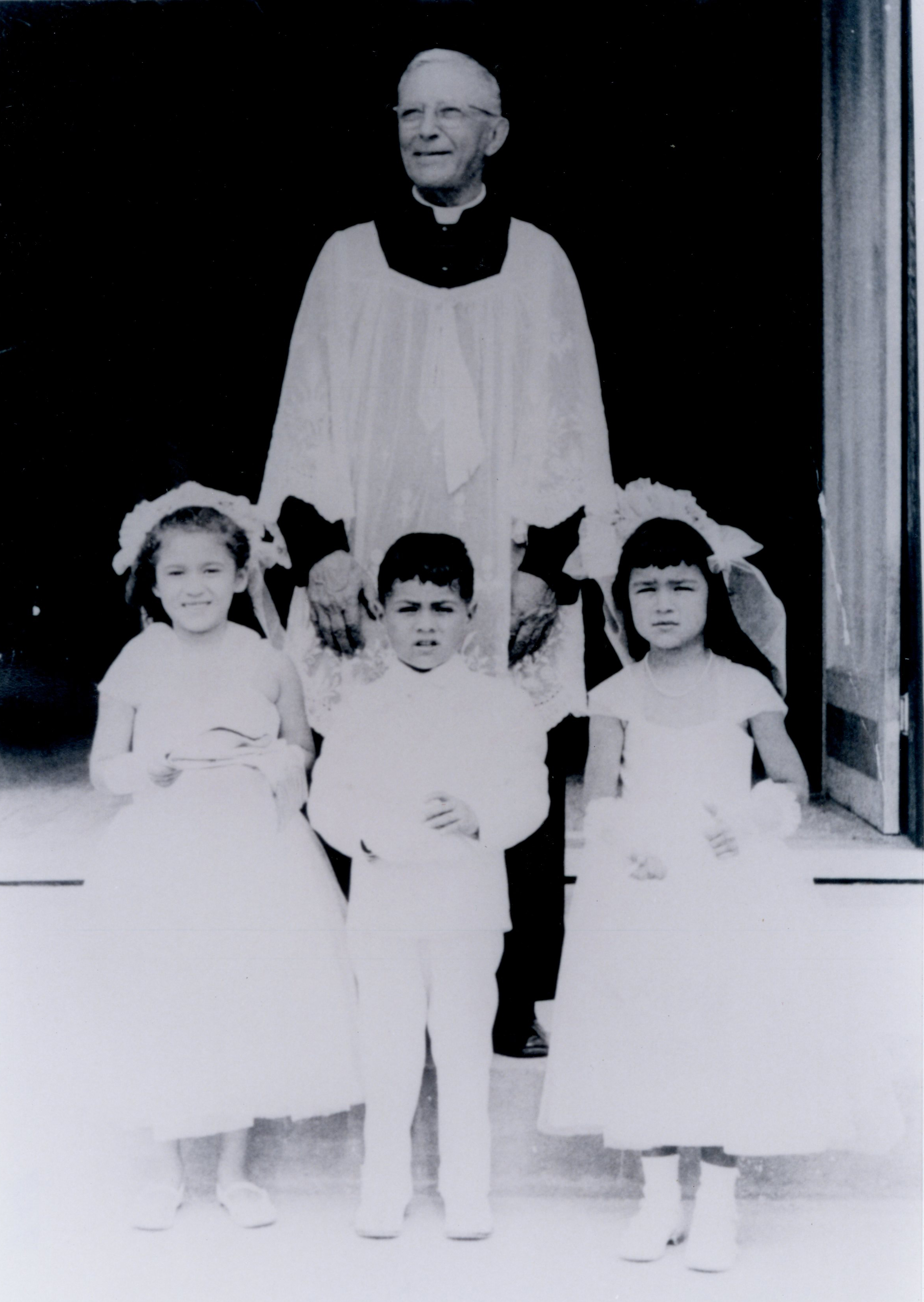 First Communion; Father Henry Parmentier and children who received First Communion at Catholic Church in Linus. Children: Virginia Munos, Ralph Jimenez, Lucy Hernandez (Pantoja).