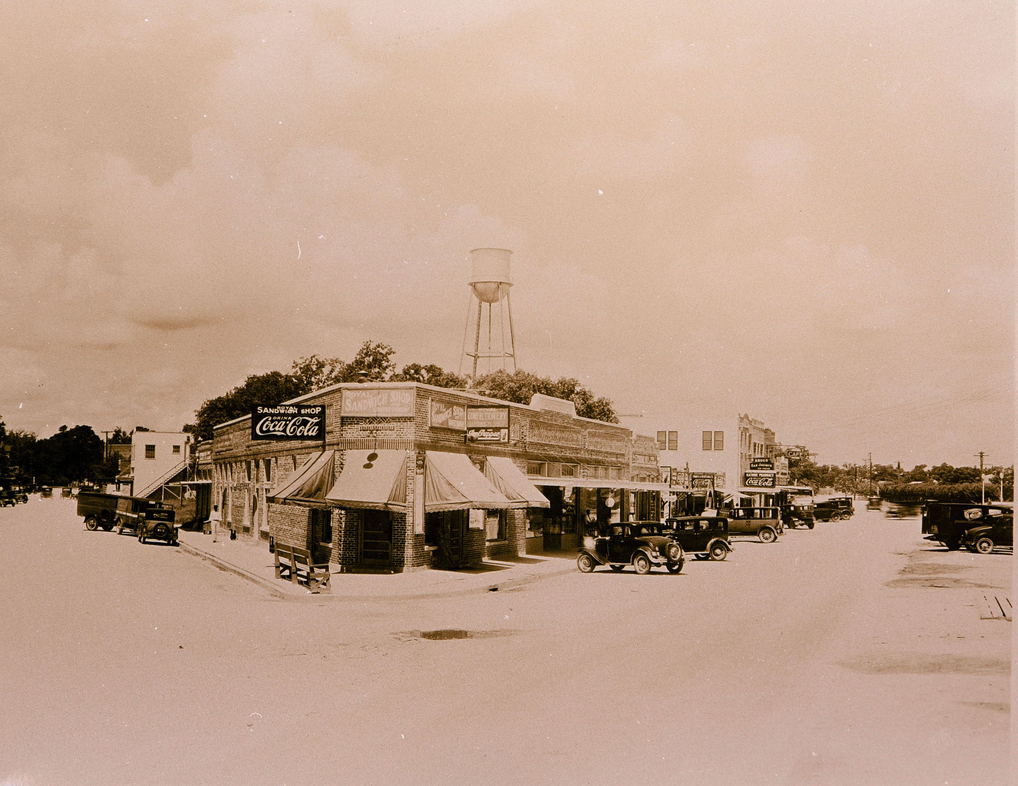 Baytown in the 1930s. Minnesota and Market Street intersection. Note the Royal Sandwich Shop in the foreground.