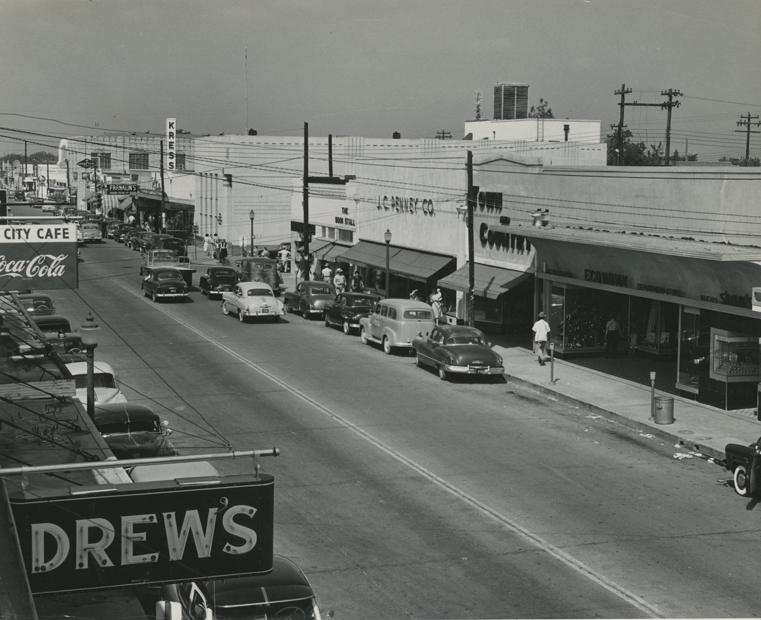 Baytown shopping district, 1952. Looking west at the W. Texas Avenue intersection at N. Gaillard, the identified businesses are The Economy (dry goods) and Town & Country (dry goods) at 214-18 W. Texas, J. C. Penney & Co. (dry goods) at 220-222 W. Texas, and The Book Stall at 224 W. Texas.