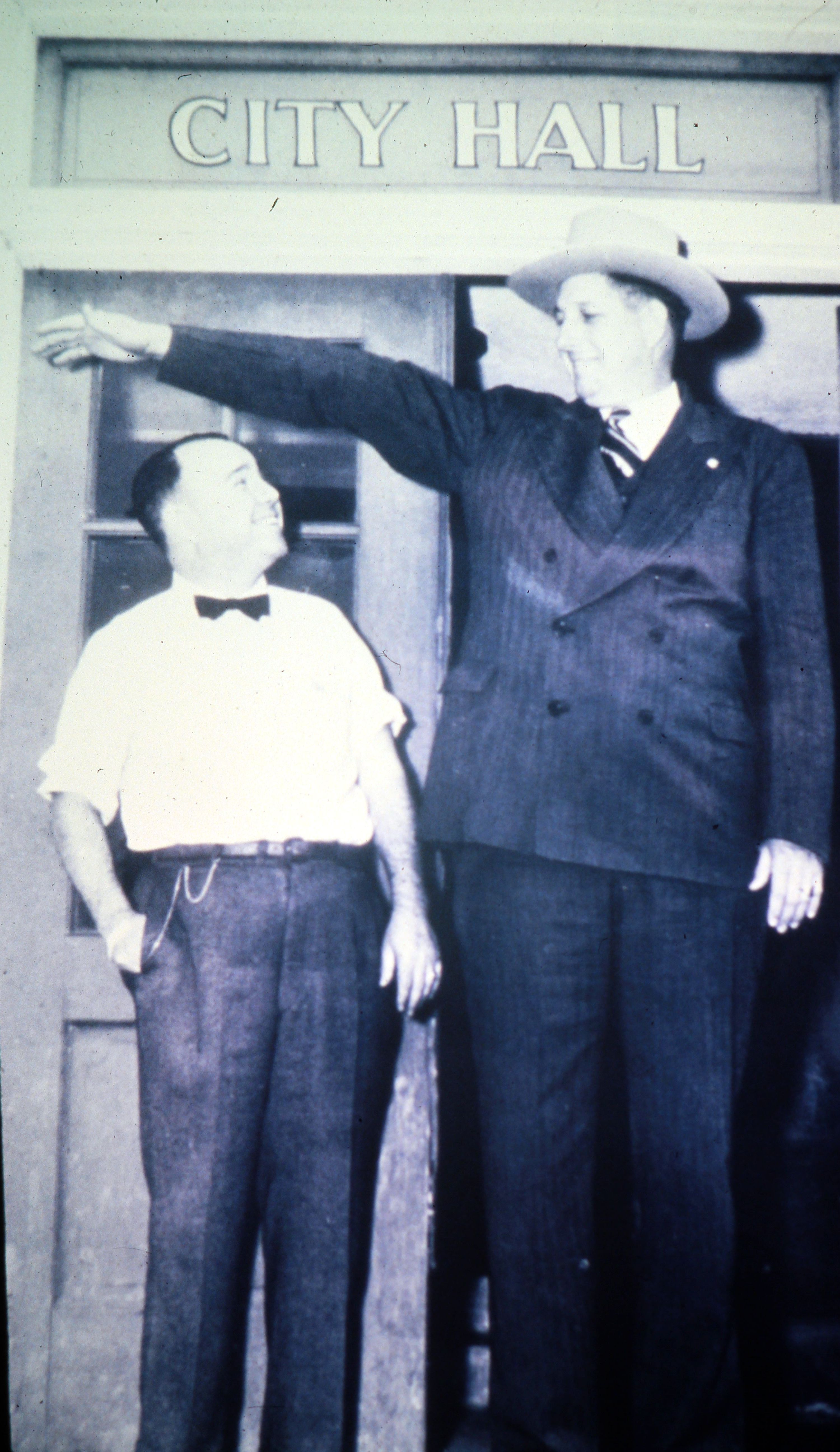 Mayors of Pelly and Goose Creek before consolidation; Mayors of Pelly and Goose Creek before consolidation, E.D. “Eddie” Cleveland, 5’ 6” and C.Q. “Kid” Alexander 6’ 9”