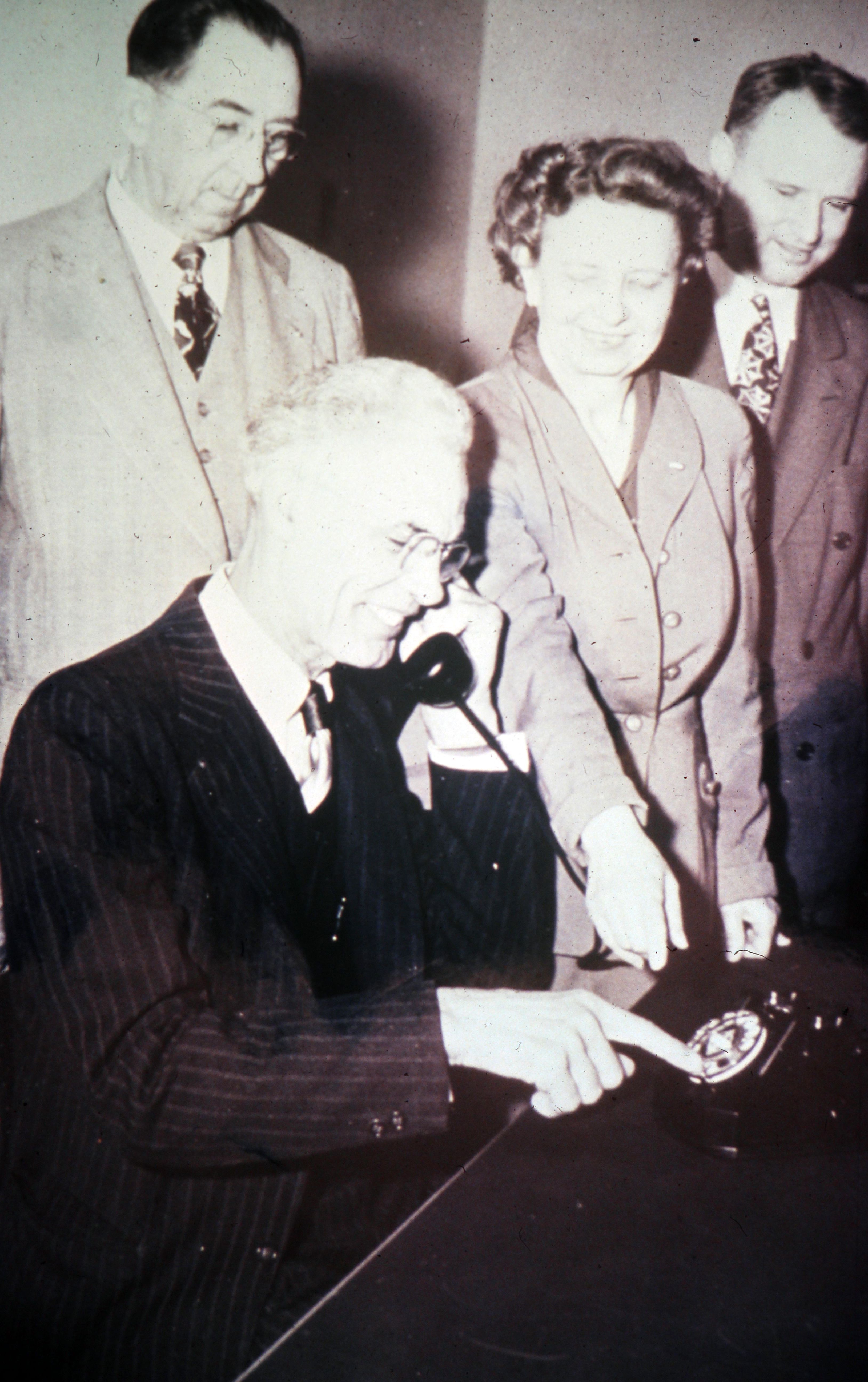 First official call placed over the new dial system on March 11, 1950. Pictured is Mayor J.A. Ward. Standing behind him is General Telephone Manager, W.W. Hunt, Mrs. Francis Rogers, chief operator, and Archie Scott, traffic engineer.