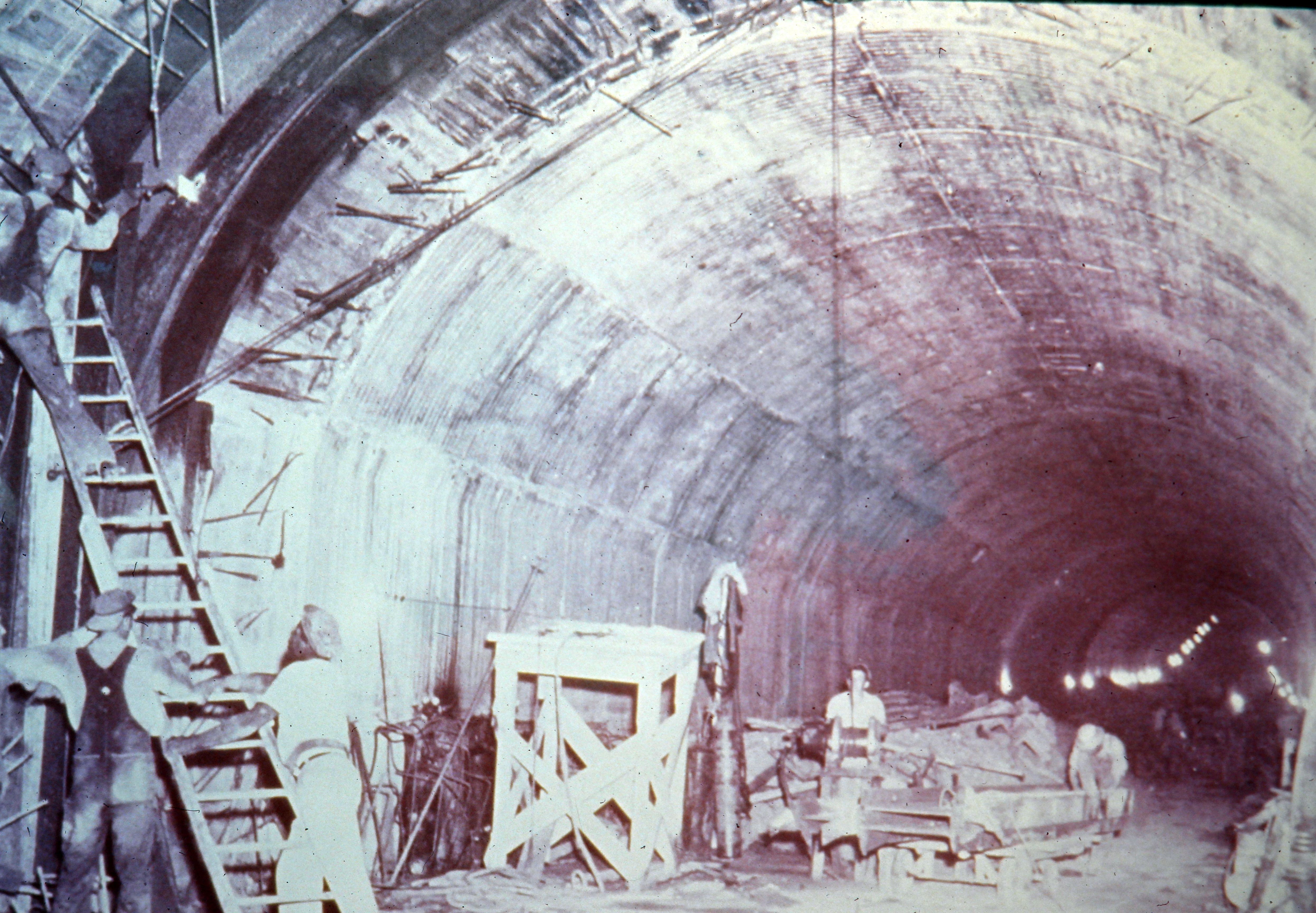 Workmen are shown removing the bulkhead from the last tube section on the almost completed tunnel.