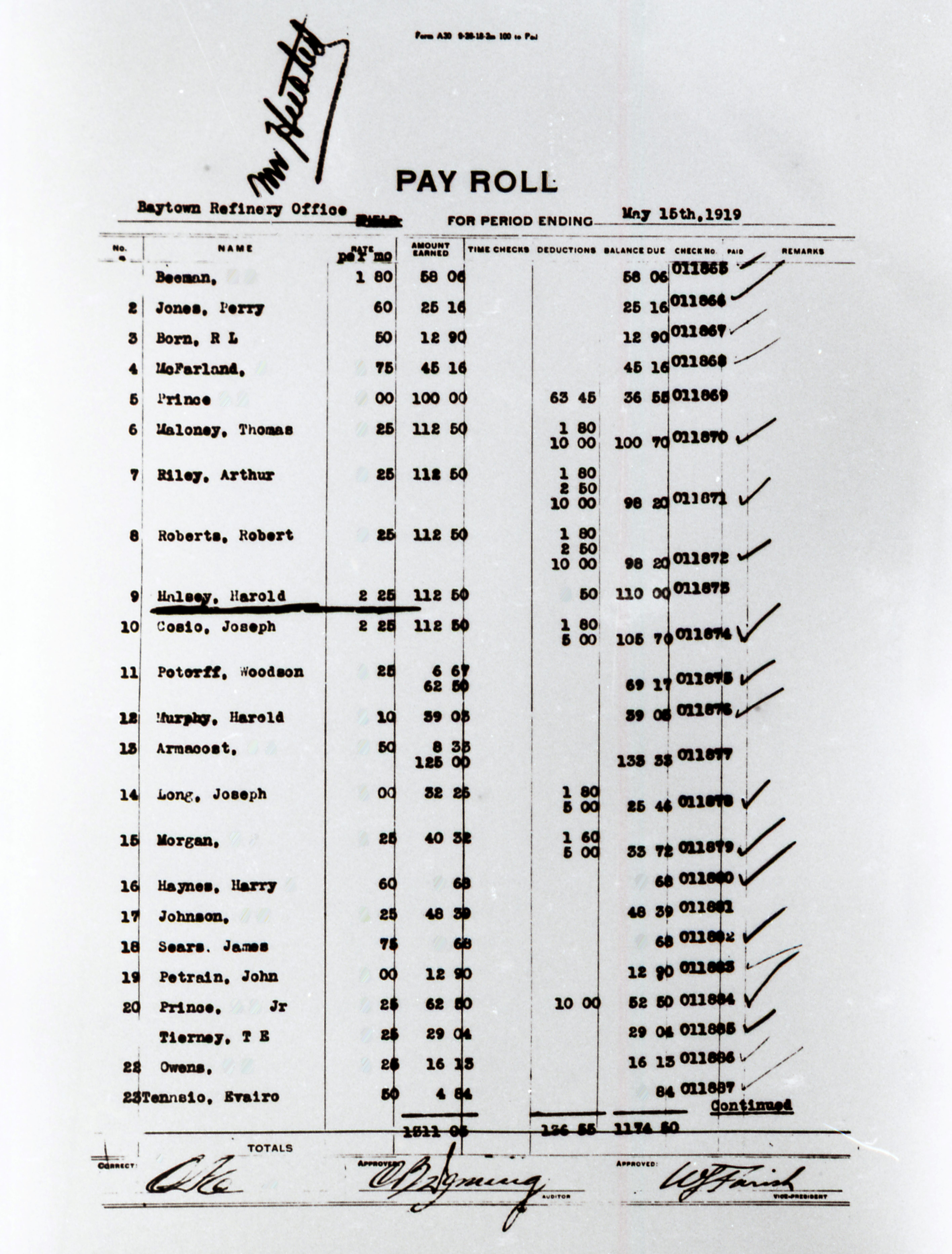 Payroll sheet, May 15, 1919, sent to Houston office. Approval was signed by W.S. Farish, vice president, who later became president. He became the first board member from Humble. Later he became President and Board Chairman of Standard Oil of New Jersey.