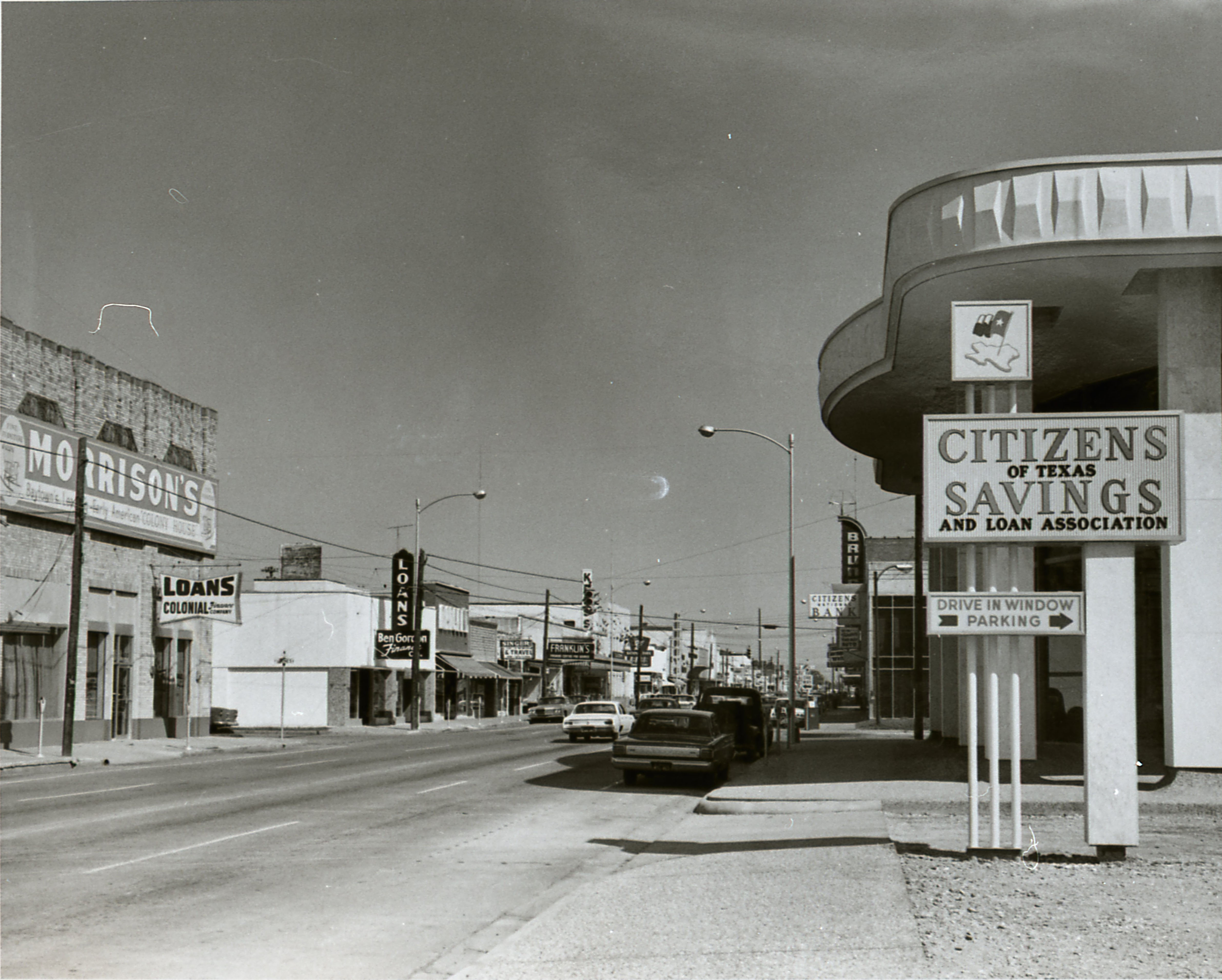 - 1960s, banks, Brunson Theater, businesses, Citizens Bank, savings and loans, street scenes, Texas Avenue