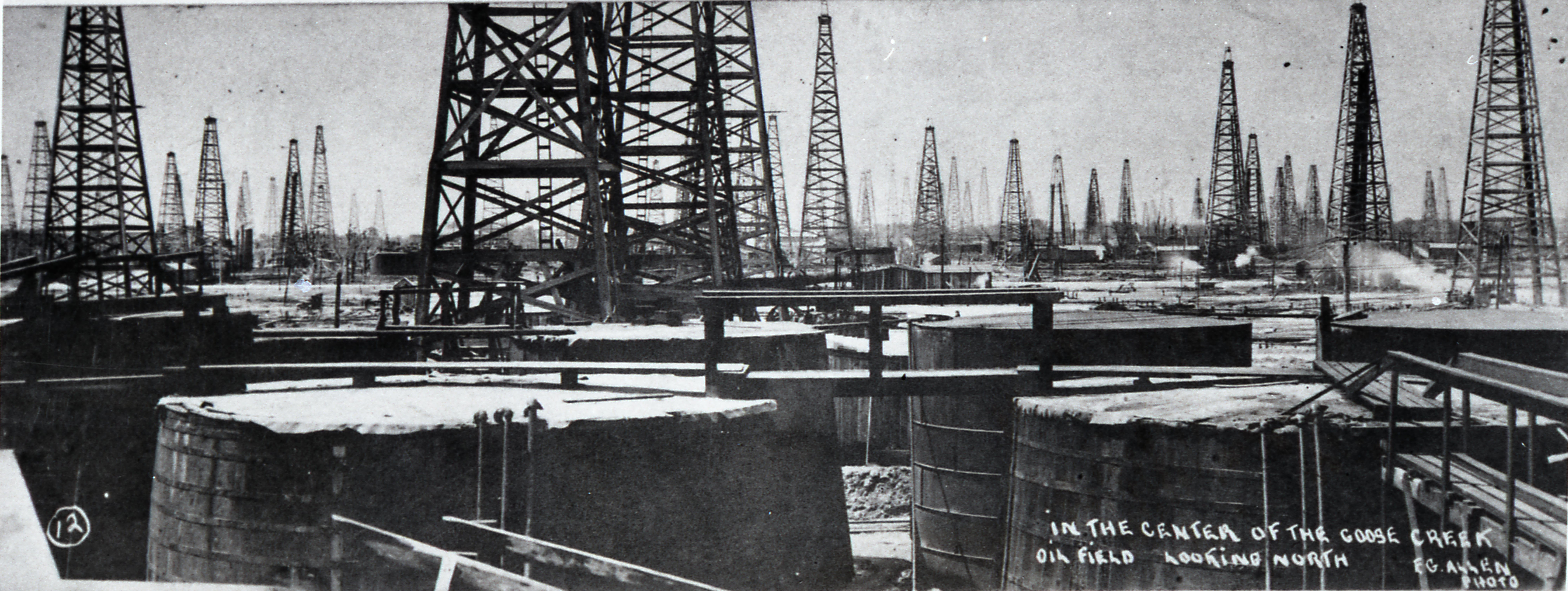 This photograph was taken at the height of the oil boom, circa 1916. The wooden tanks in the foreground were tightened down by driving hoops to keep them from leaking. Note one of the early steel, riveted tanks behind the wooden tank on the right.