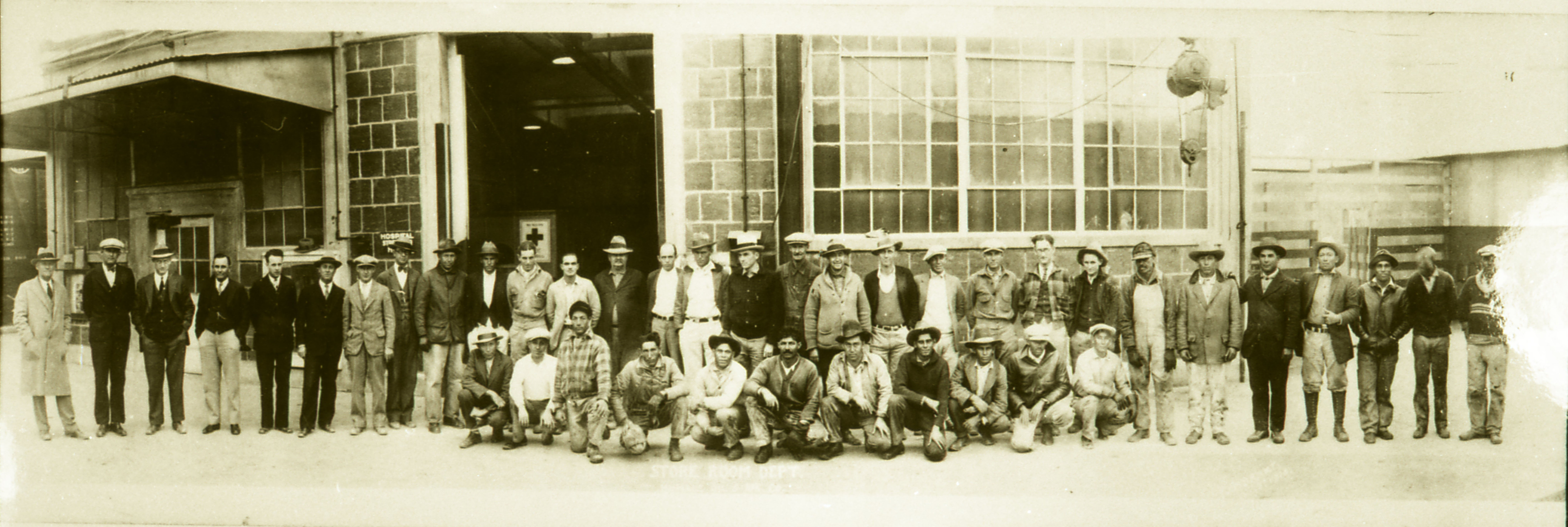 On left, standing: Ben Woods, foreman; R.R. Ball; Henry Sadik; _____; _____’ _____; Dutch Atherton; E.E. Yount; S.W. Dobson; _____; Albert Hill; _____; _____; J.F. Alcorn; A.E. Shepard; Jesse R. Casey. Others unknown.