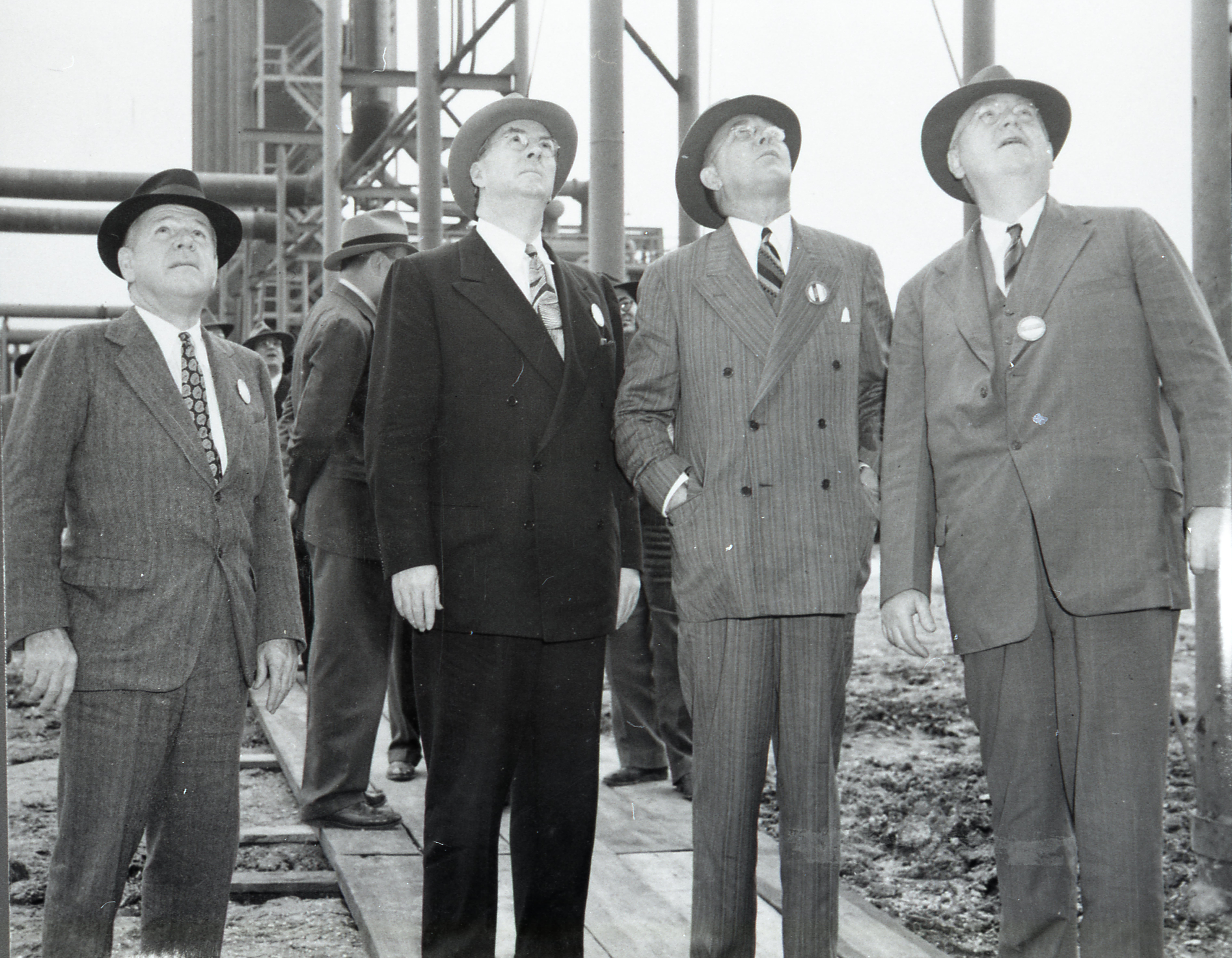 At the base of the “cat cracker” the party paused to survey the immensity of the towering structure. Left to right: H.C. Wiess, Donald Nelson, Charles Wilson, Col. Bradley Dewey.