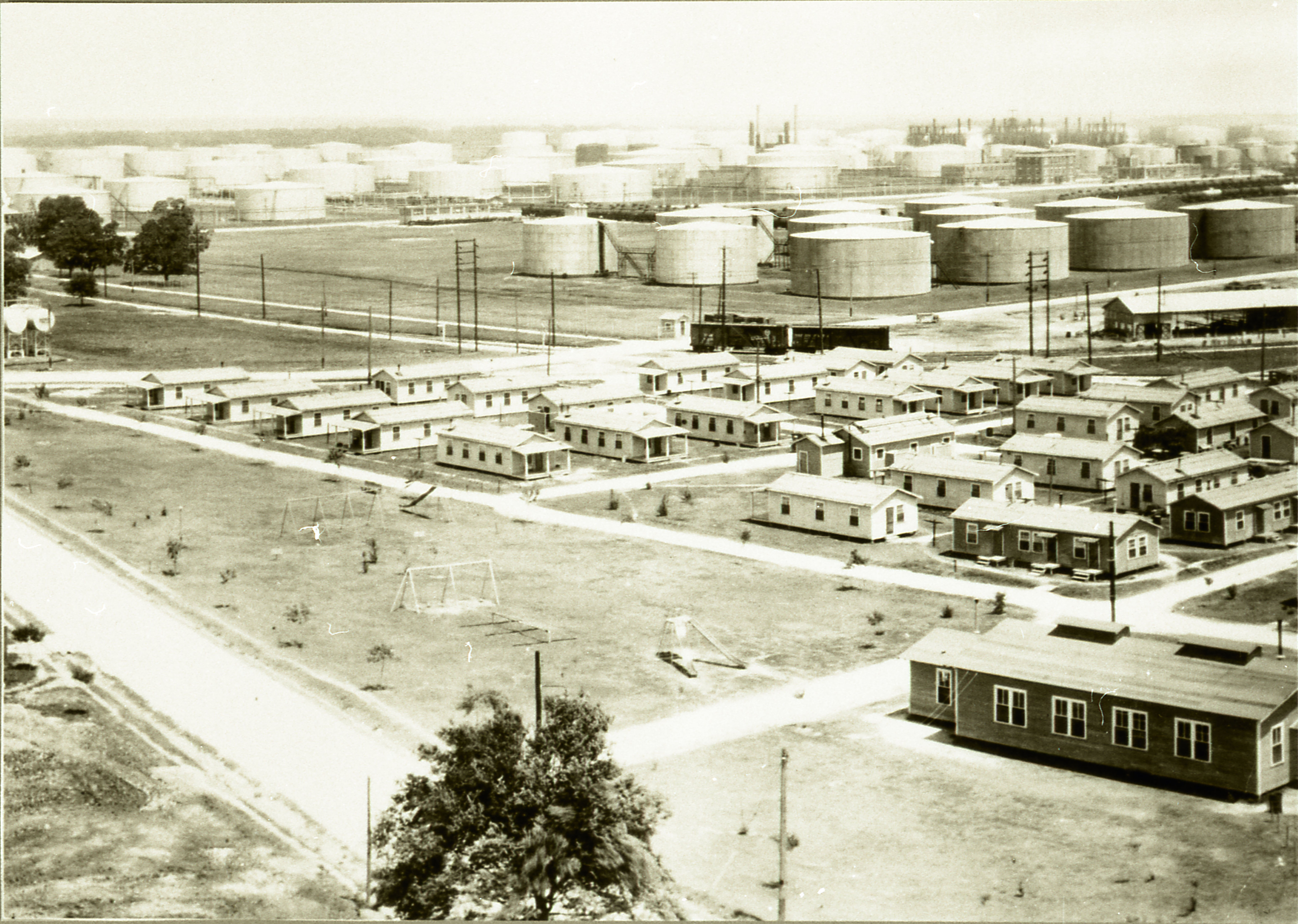 By the end of 1919, more than half of the workers at the Baytown Refinery were Mexican. Minorities were housed in separate camps. The photo shows the Housing section in 1927. The hall in the lower right corner is the Humble Oil & Refining Company Community building for minorities. Prior to 1927, a school for Hispanics was held in this building.