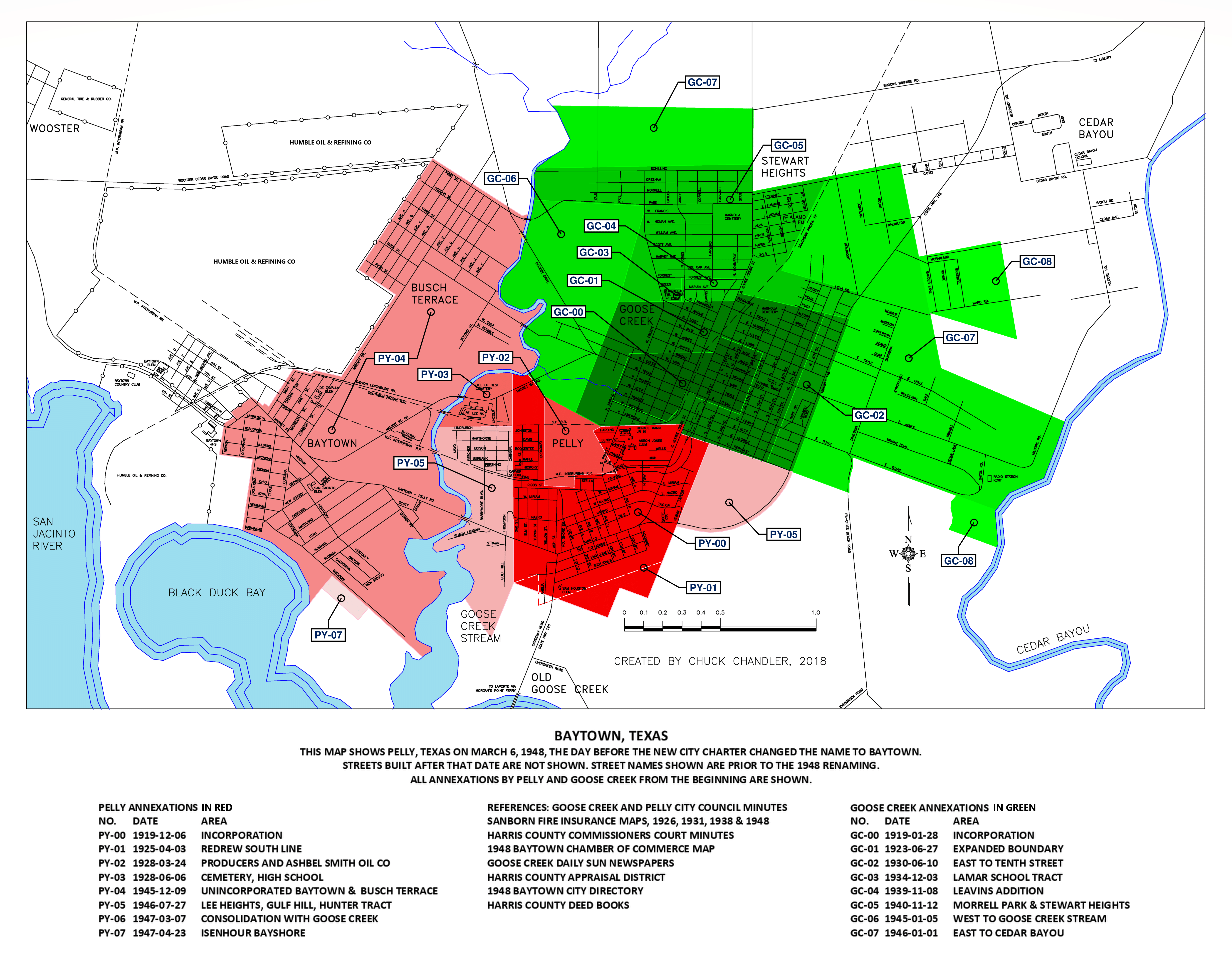 Detailed annexation map of Goose Creek and Pelly, leading up to consolidation in 1948. Researched and provided by Chuck Chandler, with citations on the map.