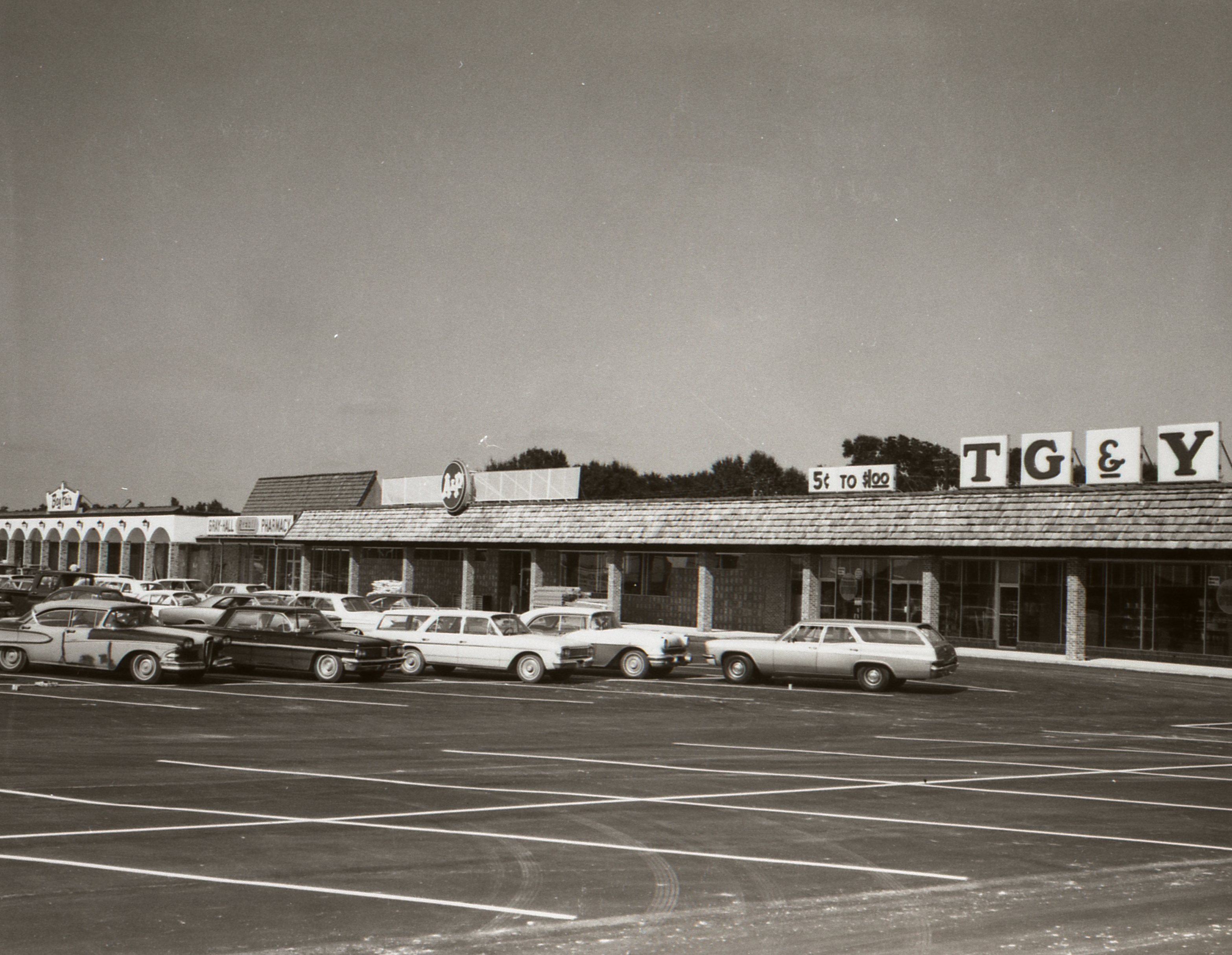 Bay Plaza Shopping Center circa 1968 ; Close-up of shopping center showing TG&Y, A&P, Bay Fair and Gray-Hall Pharmacy
