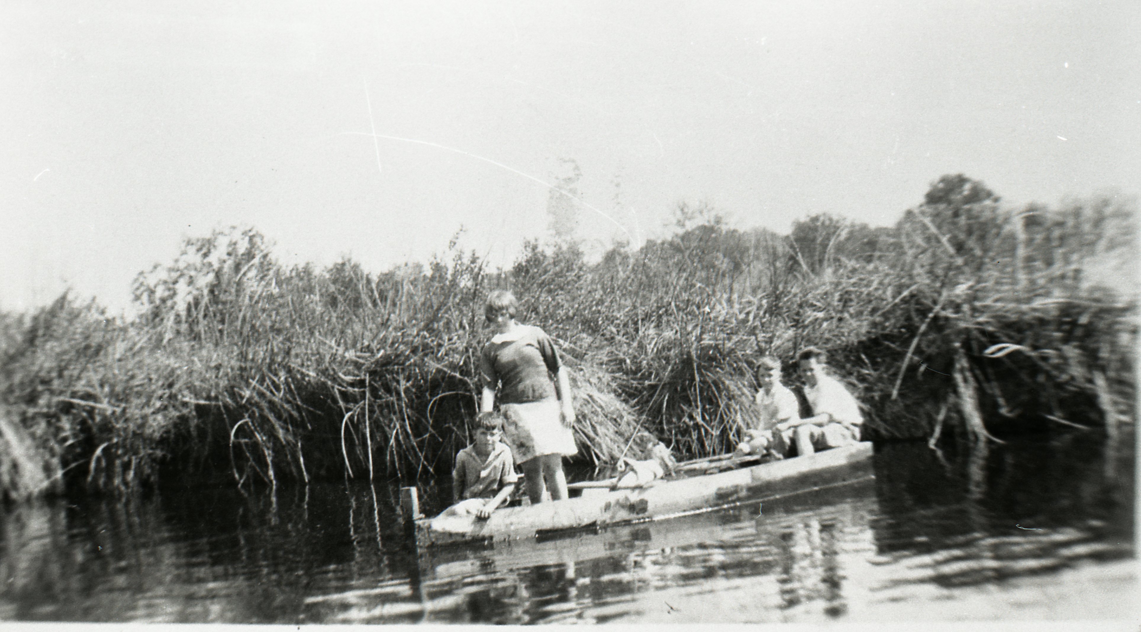 Goose Creek in early 1920s; Unidentified children in a handmade pirogue circa 1920's.