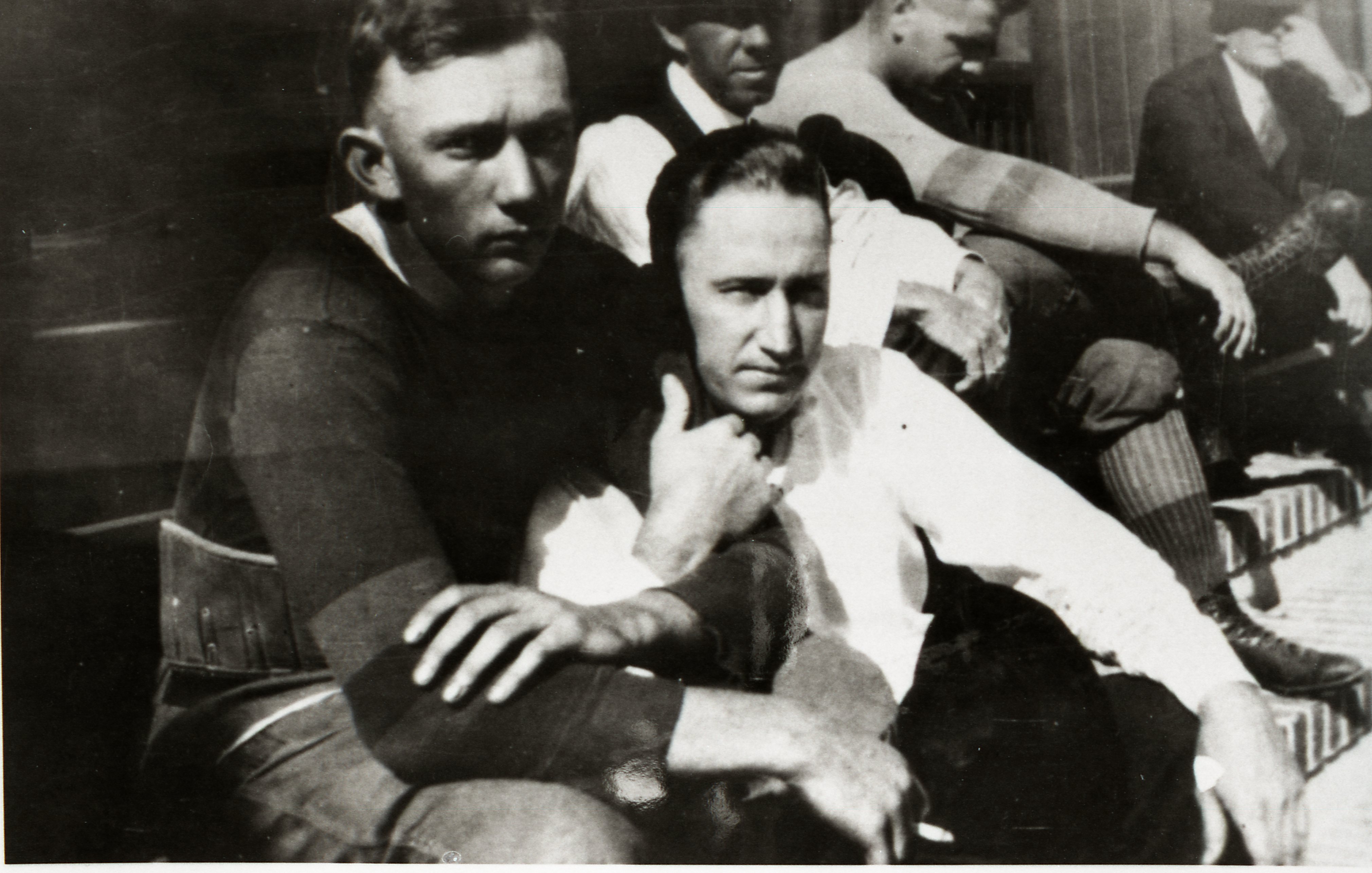 Humble football players; Players sitting on steps of men's dormitory circa 1924. Man in shirtsleeves in foreground is C.E. Rodecape. Man in football uniform is Pat Osborne.