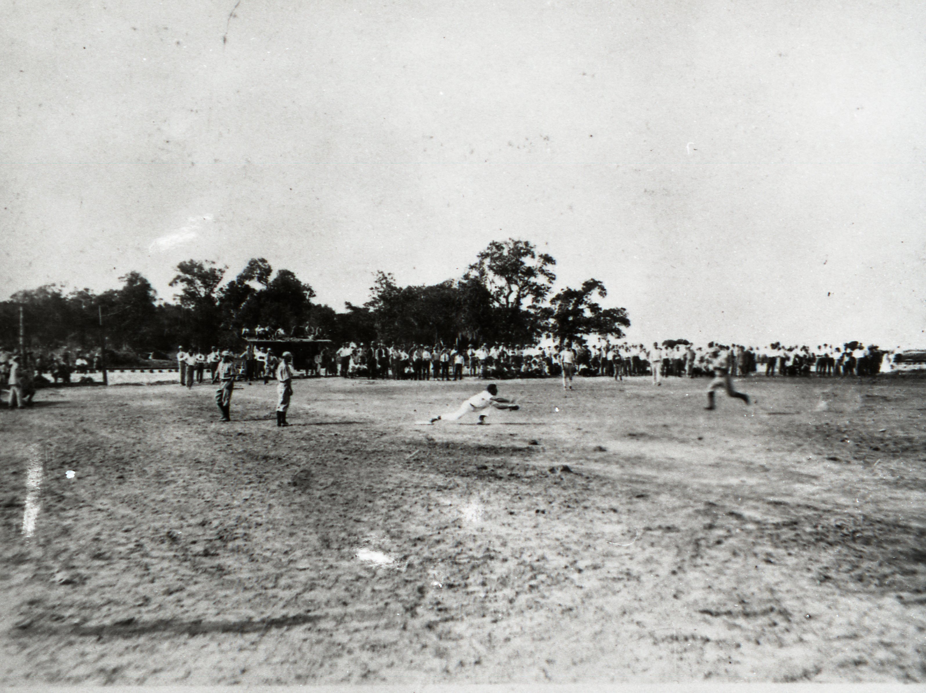 Humble Oilers Baseball - Action at first base, 1920; Humble Oilers Baseball Team at the baseball diamond located near Corral Gate. This was before the new ball park was built in 1925.