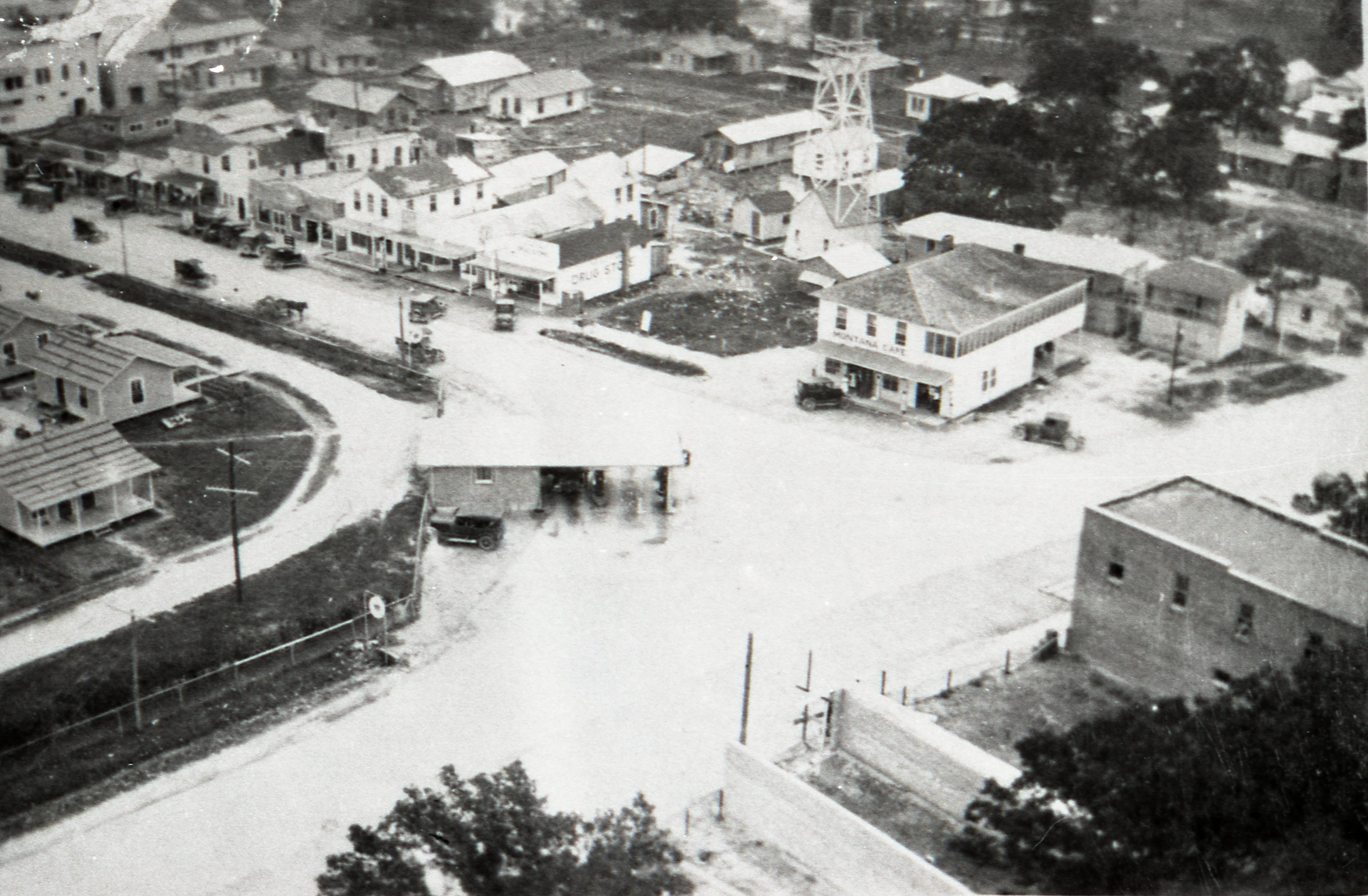 Main Street, Old Baytown; On right corner is the Montana Cafe. Back side of photograph reads: G.D. (Jimmie) Richardson, No. 2 flash coil, 1926.