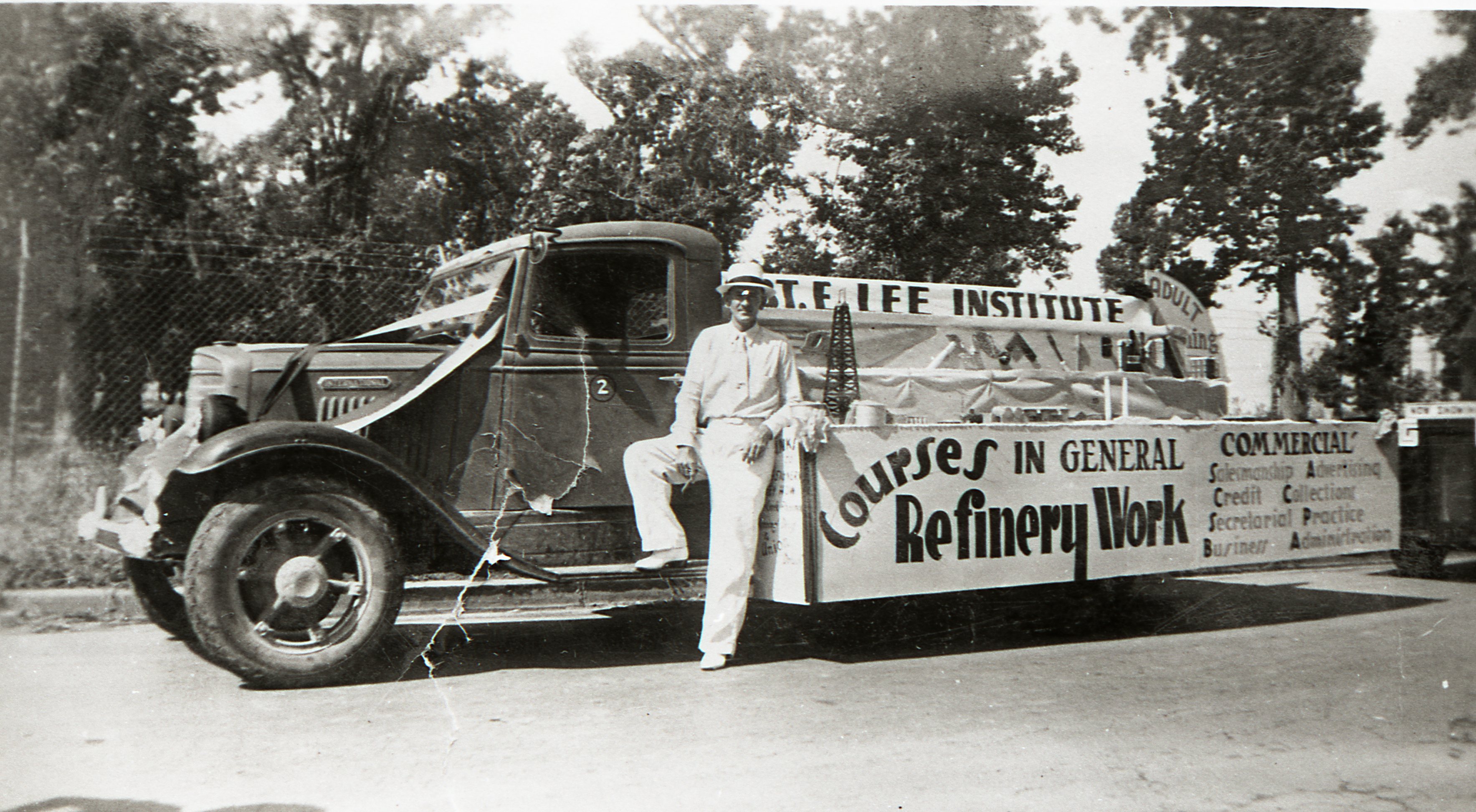 Lee Institute Float, 1937 Labor Day Parade; Truck driver for the Temple Lumber Company and the prize-winning float representing the newly formed Lee Institute in the 1937 Labor Day parade. The institute for adult vocational education was later incorporated into Lee College.