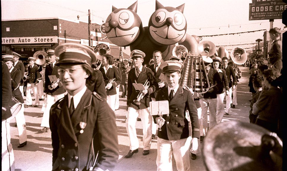 Christmas parade down Texas Avenue, Goose Creek, Texas, 1939. Across the street from the Western Auto Associate Store, 222 W. Texas Ave. “Welcome to Goose Creek” sign is visible.