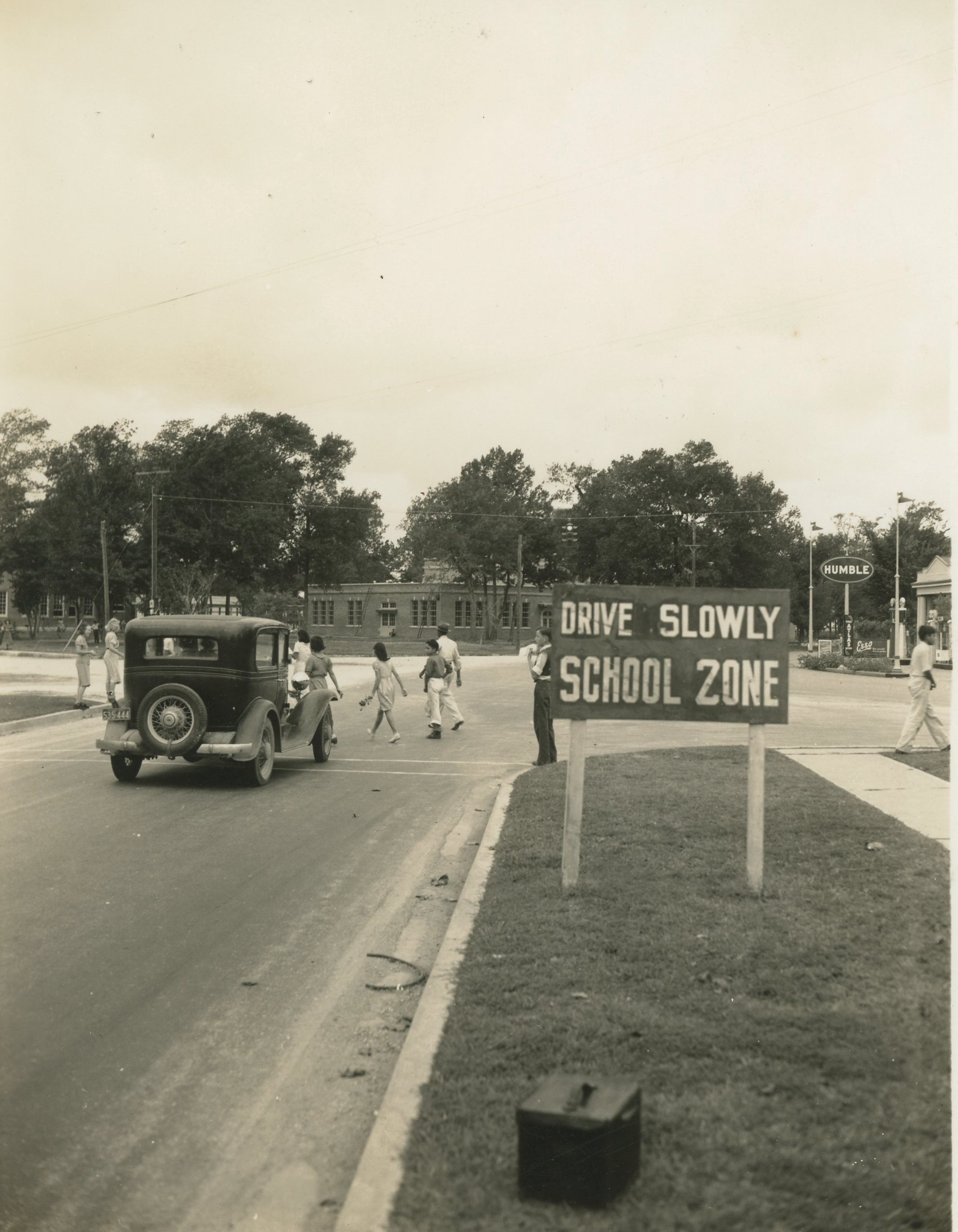 Intersection of Wisconsin and Market Streets with Baytown Junior High in the background, circa 1930's.