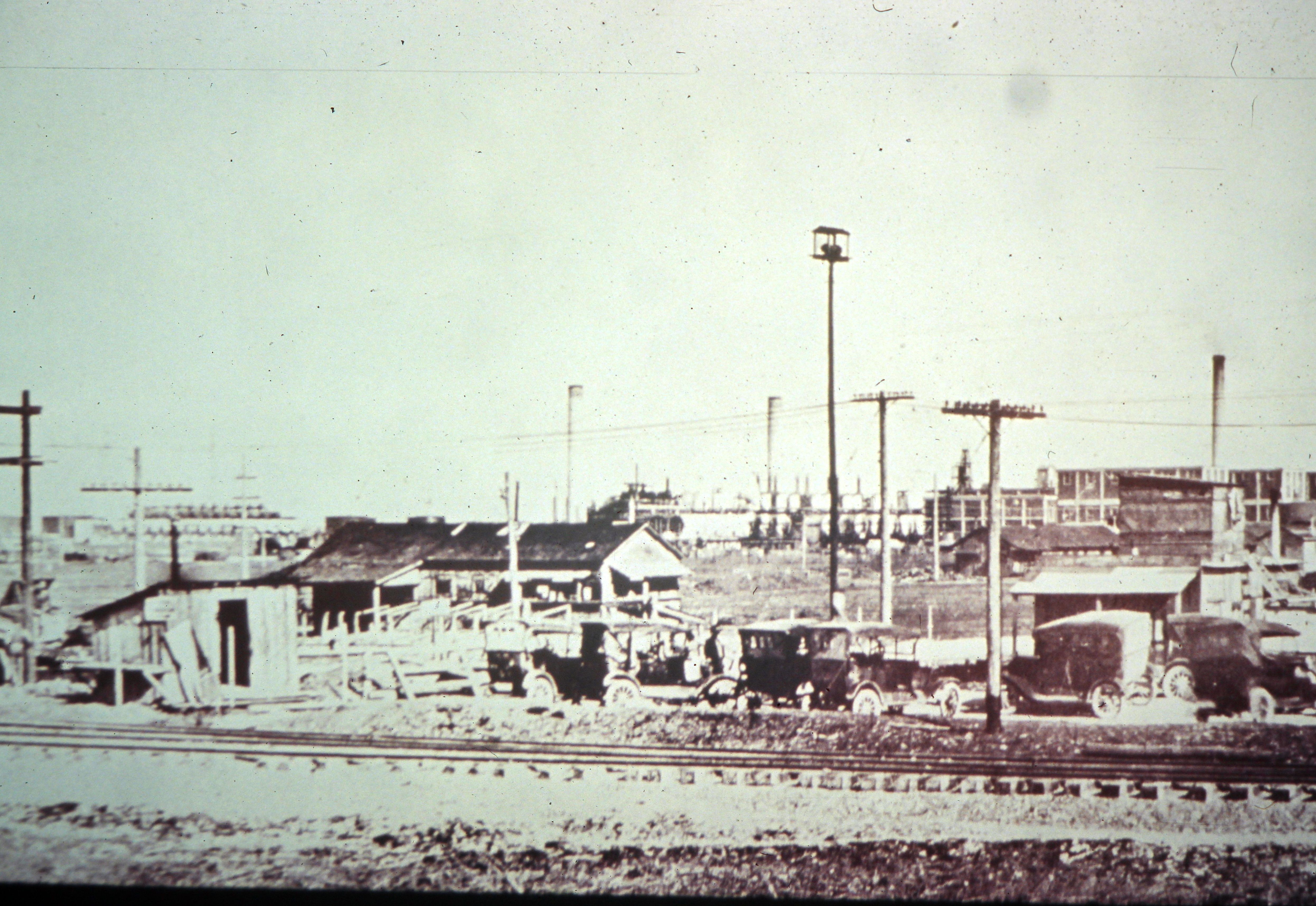 View of the east gate entry at the Humble Refinery 1924. Pictured is the first lab, Burton high pressure stills, and the old filter house.
