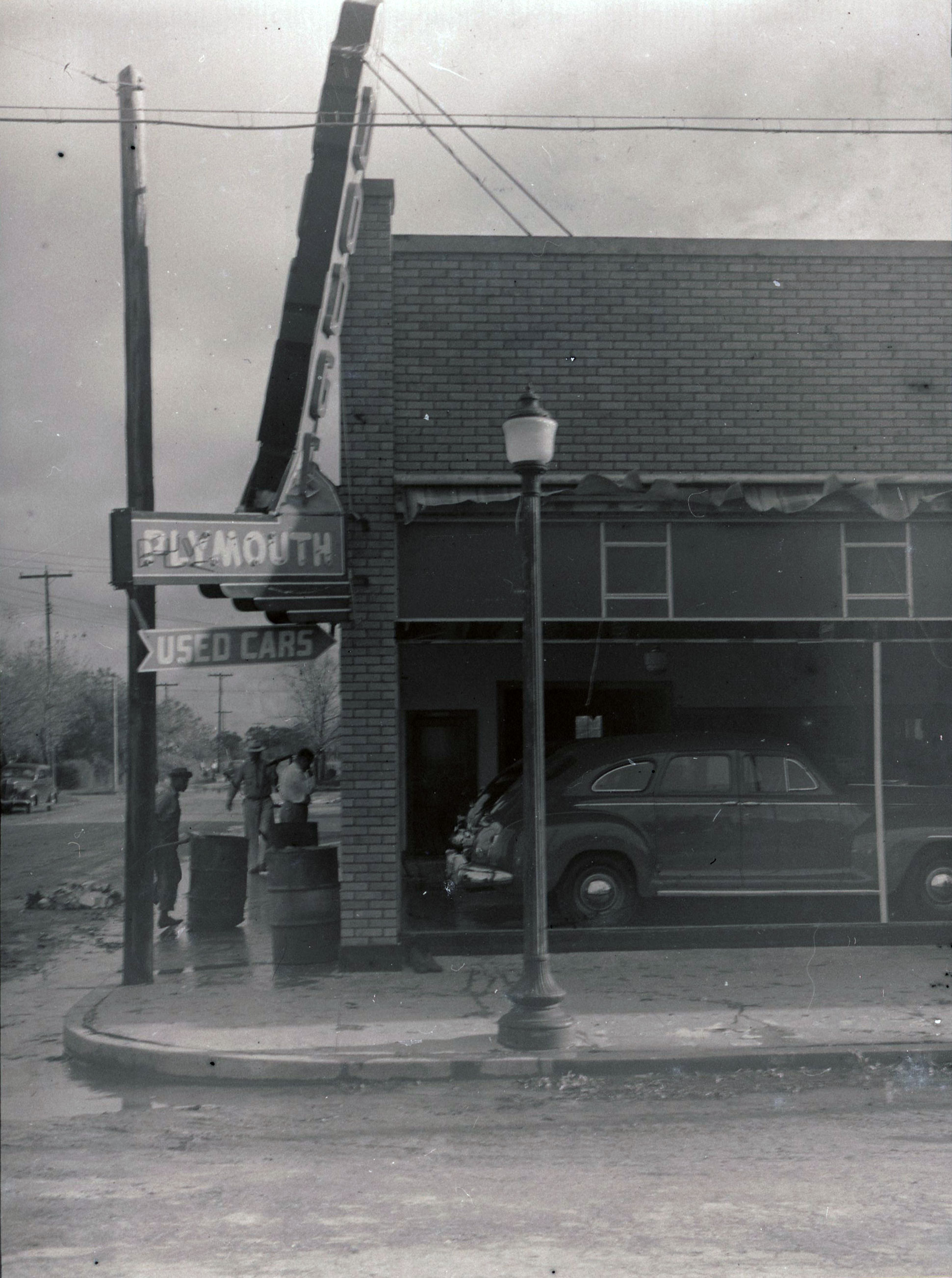 E. S. Cathriner, Inc., Dodge-Plymouth sales and service building damage. Building was located at the corner of Texas Avenue and Pruett Street in Goose Creek